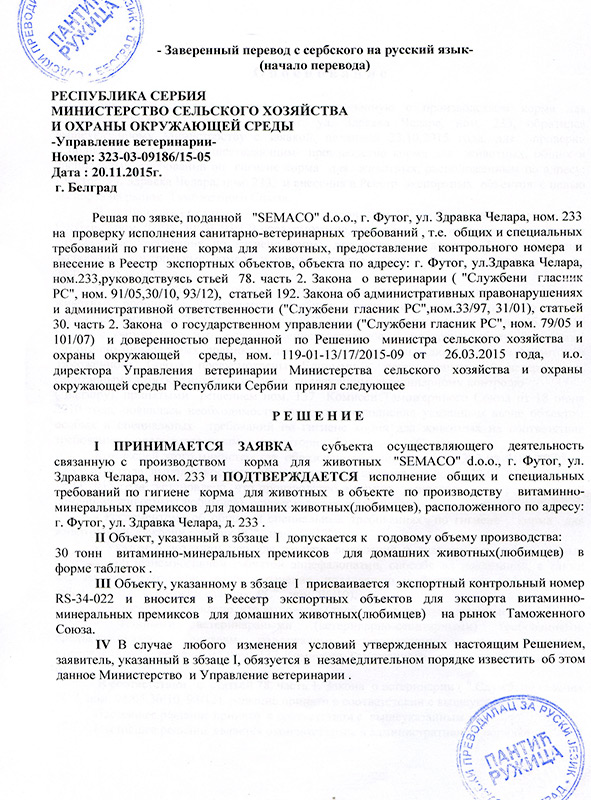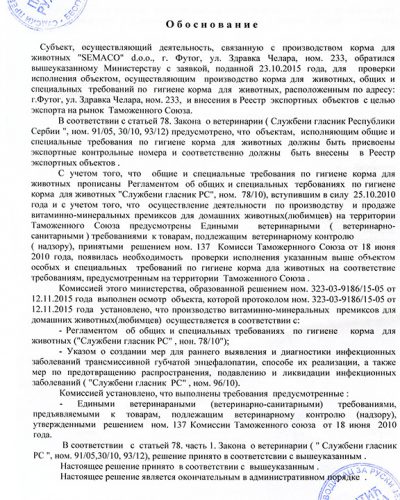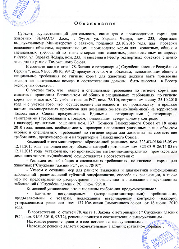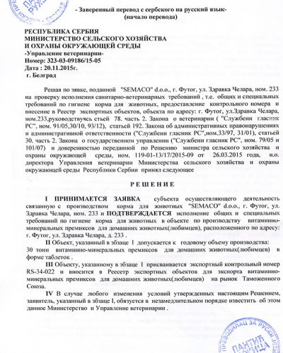 Благодаря высокому уровню контроля и прозрачности, СEMAKO имеет сертификаты для экспорта своей продукции в страны Европейского Союза, региона CEFTA и Российской Федерации. Наши стандарты качества признаны международными партнёрами, что подтверждает наш статус надёжного производителя и делового партнёра в сфере ветеринарной и пищевой промышленности.